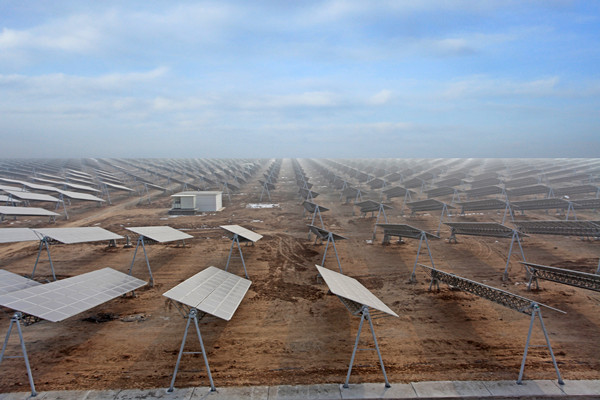 寧夏中衛(wèi)并網(wǎng)光伏電站總規(guī)模:太陽(yáng)能光伏電池組件裝機(jī)容量共60MWp,一二期電站工程采用恩菲自主研發(fā)的8°角斜單軸智能柔性聯(lián)動(dòng)追日跟蹤系統(tǒng),于2011年12月并網(wǎng)并投入運(yùn)營(yíng);三期電站工程采用固定式支架安裝方式,于2013年1月并網(wǎng)并投入運(yùn)營(yíng)。 該項(xiàng)目主要特點(diǎn)包括:一、二、三期工程均利用綠色能源——太陽(yáng)能發(fā)電技術(shù),該技術(shù)綠色無(wú)污染;其中一期二期工程采用自主研發(fā)的智能聯(lián)動(dòng)跟蹤系統(tǒng)的方式,對(duì)比國(guó)內(nèi)已投產(chǎn)的同規(guī)模光伏電站,該工程技術(shù)先進(jìn)、國(guó)產(chǎn)化程度高、投資省;配置了跟蹤系統(tǒng)智能監(jiān)控畫面,全面實(shí)現(xiàn)電站智能化管理并大大提高了電站的綜合效益。